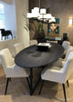 Estetika stola ističe se oborenim ivicama i zaobljenim ćoškovima i plocom koja prati blago ovalan oblik, dodajući sofisticiranost i bezbednost. Njegove elegantne, od punog drveta dimenzija 40mm debljine zakosene pod uglovima dodaju suptilan industrijski dodir, istovremeno pružajući stabilnost i pouzdanost. Plastificirane u elegantnu crnu mat boju, noge su izdržljive i lako se održavaju.