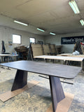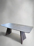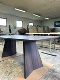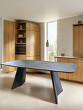 Estetika stola ističe se oborenim ivicama i zaobljenim ćoškovima i plocom koja prati blago ovalan oblik, dodajući sofisticiranost i bezbednost. Njegove elegantne, od punog drveta dimenzija 40mm debljine zakosene pod uglovima dodaju suptilan industrijski dodir, istovremeno pružajući stabilnost i pouzdanost. Plastificirane u elegantnu crnu mat boju, noge su izdržljive i lako se održavaju.